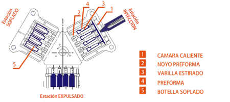 La máquina es capaz de producir envases en tres etapas gracias a un molde con 3 estaciones.