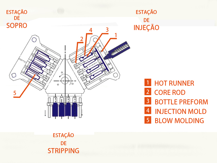 A máquina é capaz de produzir recipientes em três etapas, graças a um molde com 3 estações.